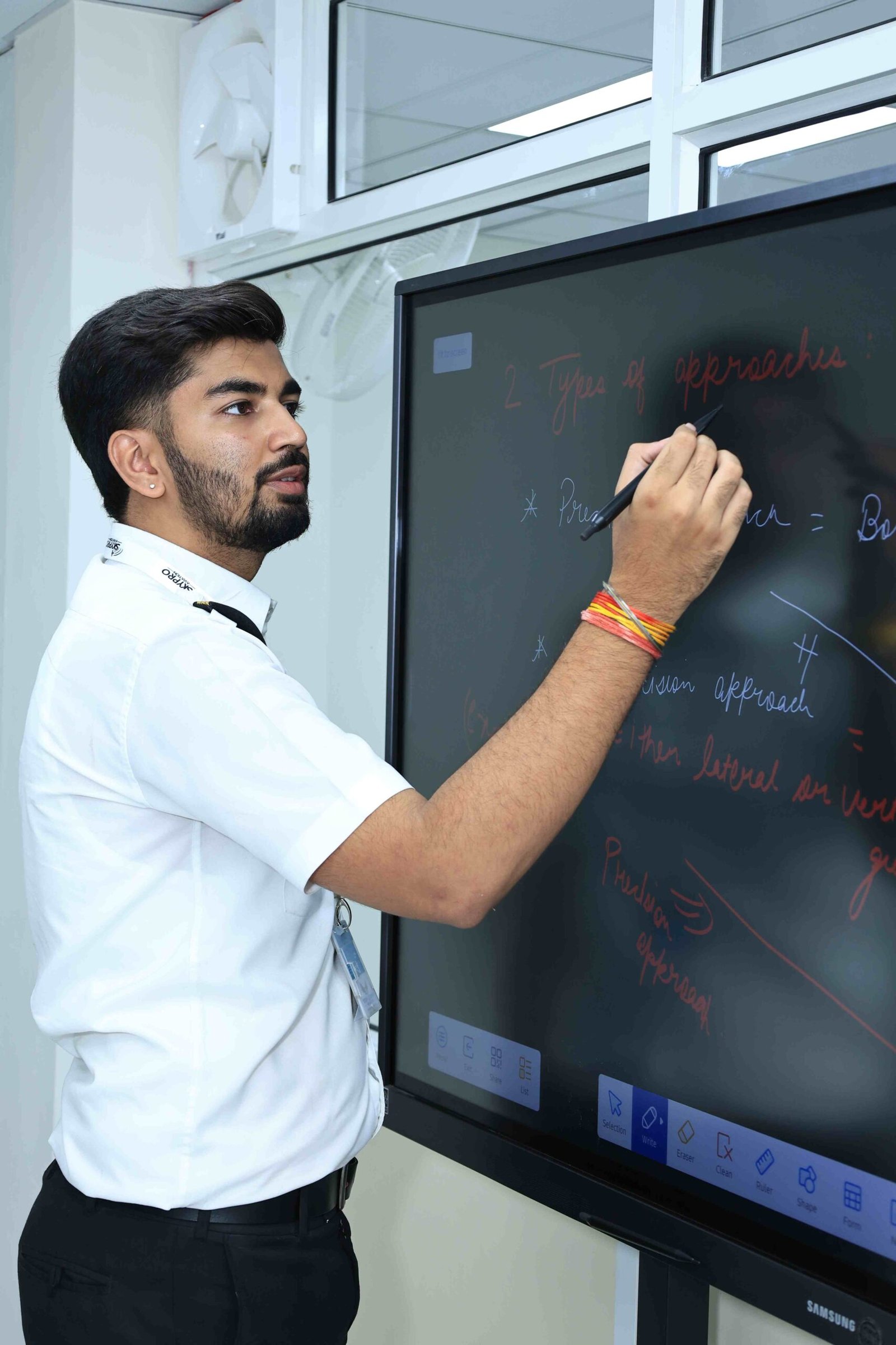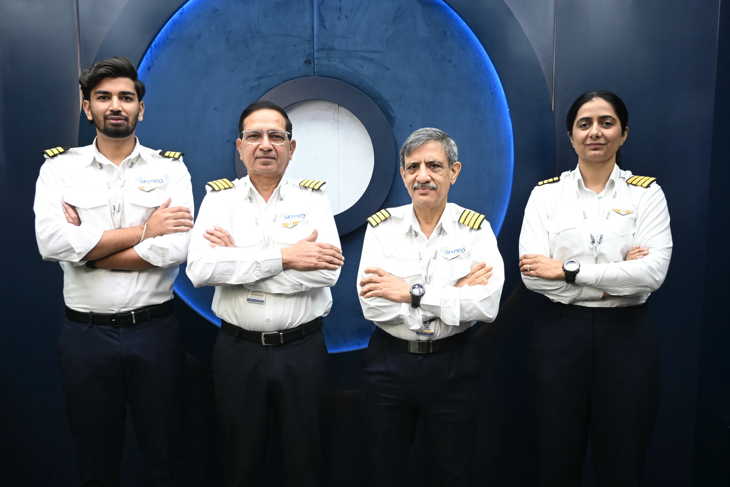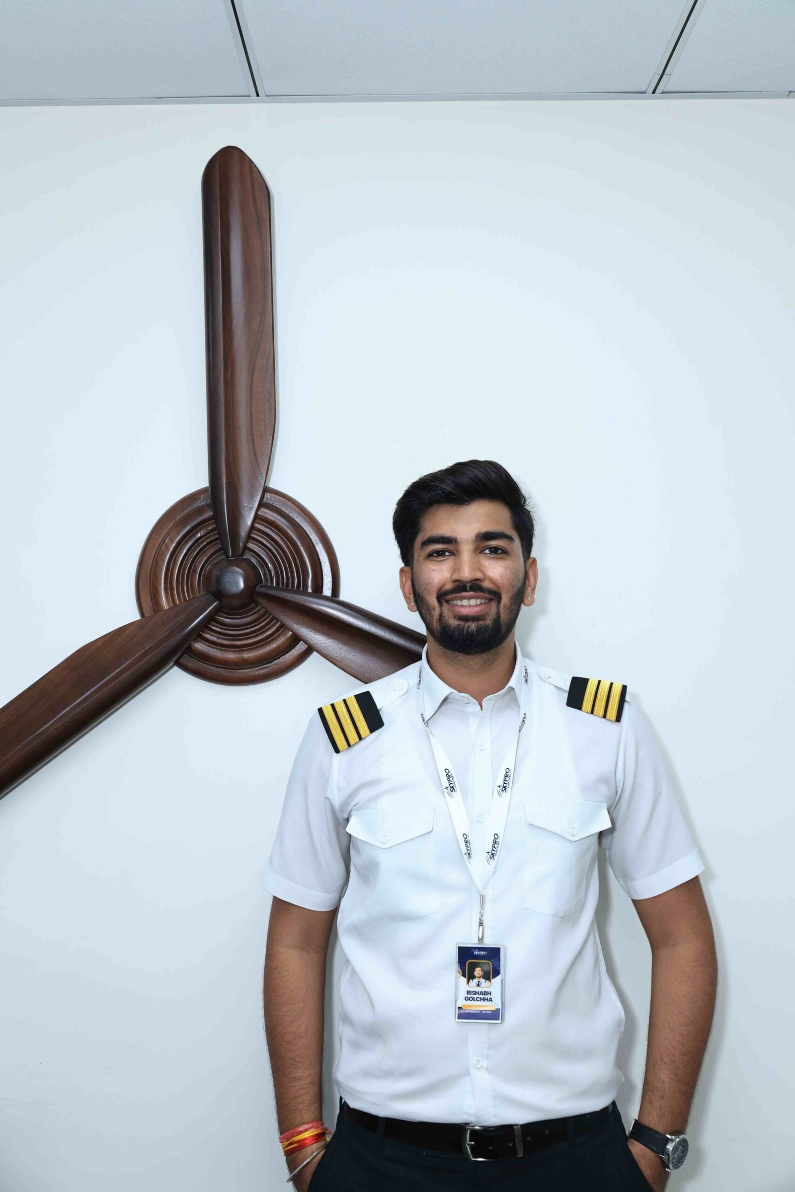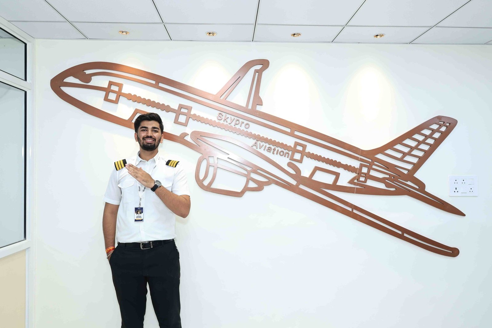 Students must wear the official SkyPro Aviation uniform during training hours. Uniforms include a white pilot shirt, black trousers, and epaulets. Proper grooming and polished shoes are required.
